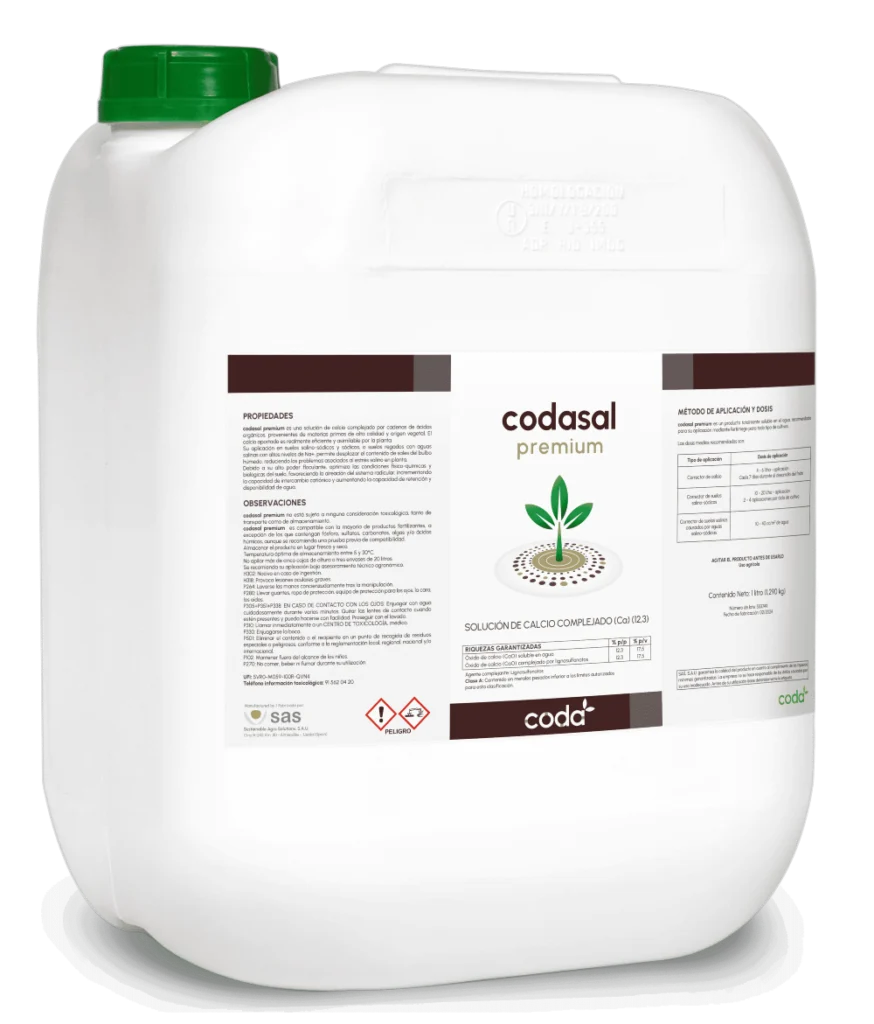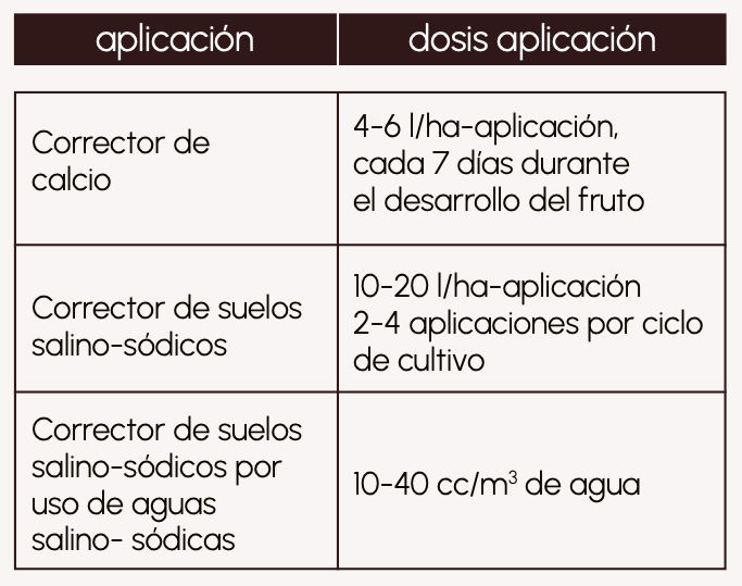17,50% CaO + ácidos orgánicos (p/v) Solución de calcio complejado a cadenas de ácidos orgánicos de origen vegetal de alta calidad diseñado para aportar calcio al cultivo, facilitar la movilización de sales del bulbo húmedo reduciendo el estrés osmótico en planta y mejorar las propiedades físico químicas y biológicas del suelo.