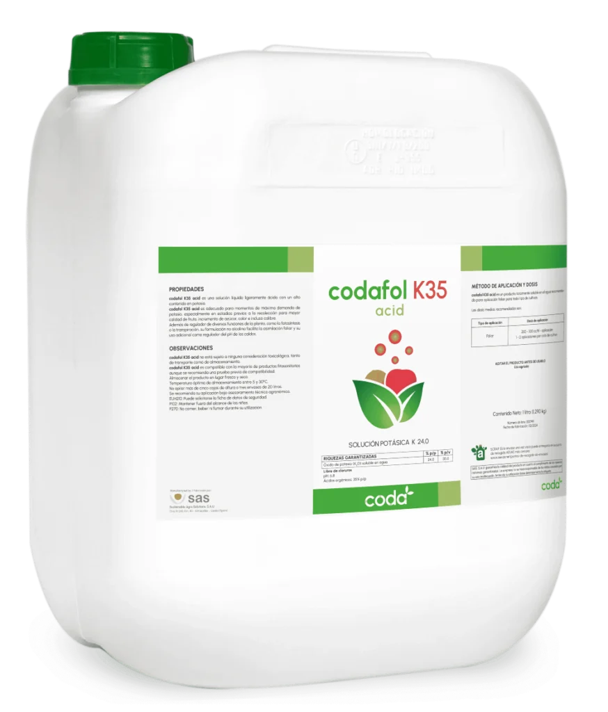 Adecuado para momentos de máxima demanda de potasio, especialmente en estadios previos a la recolección para mayor calidad de fruto, incremento de azúcar, color e incluso calibre. Además de regulador de diversas funciones de la planta como la fotosíntesis o la transpiración, su formulación no alcalina facilita la asimilación foliar y su uso adicional como regulador del pH de los caldos (tampón).