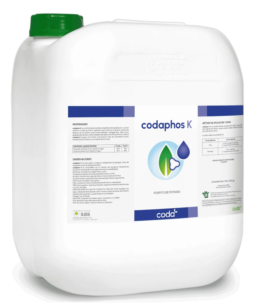 Formulación fosfo-potásica de alta graduación (700 g/l) y acción sistémica a base de fosfito, específica para reforzar el sistema natural de defensa de la planta contra enfermedades criptogámicas, tales como: podredumbre de raíz y enfermedades del cuello como Phytophthora y Pythium. Además, posee una función nutricional en fase de crecimiento activo, favoreciendo la floración y el cuajado de los frutos.